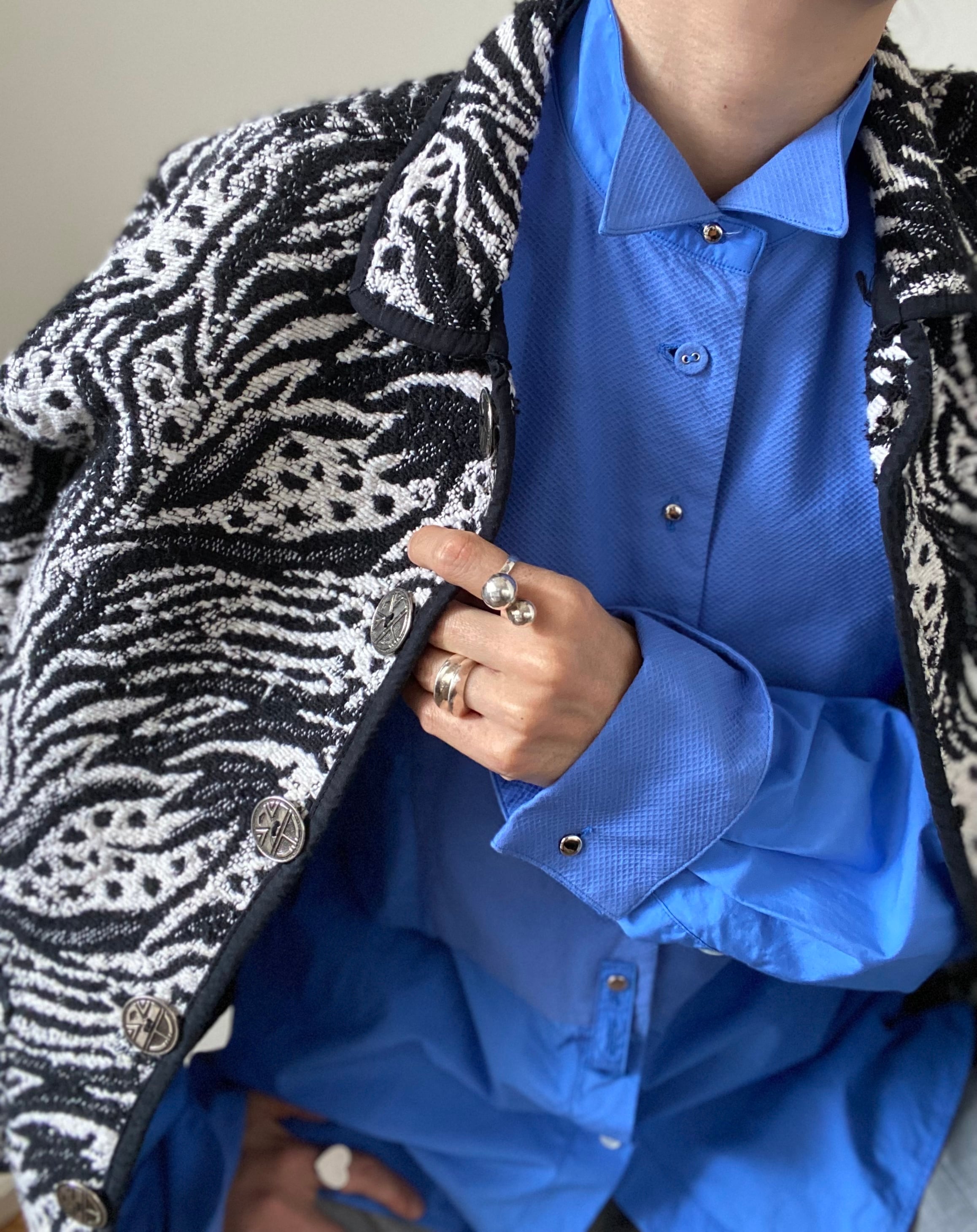 白×黒なので、コーディネートの幅が広い柄物ジャケットです。